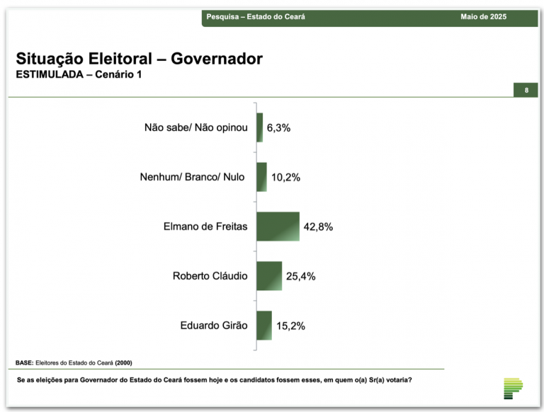 O Paraná Pesquisas ouviu 2.000 eleitores em 80 municípios cearenses entre os dias 14 e 18 de maio. A margem de erro é de 2,2 pontos percentuais, para mais ou para menos, e o nível de confiança de 95%.