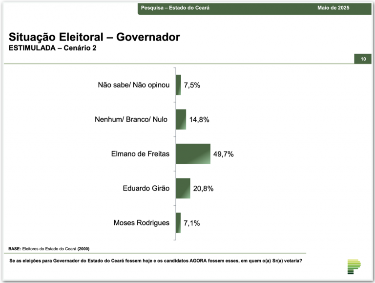 O instituto monitorou, ainda, um segundo cenário de disputa, sem o candidato do PDT. Elmano, neste caso, tem uma vantagem ainda maior sobre os adversários. O atual governador soma, nesta disputa, 49,7%, sete a mais do que no primeiro cenário. Girão, por sua vez, sobe pouco mais de cinco pontos, soma 20,8% e fica com a segunda colocação. A disputa é fechada com o deputado federal Moses Rodrigues (União), que tem 7,1%. Confira:
