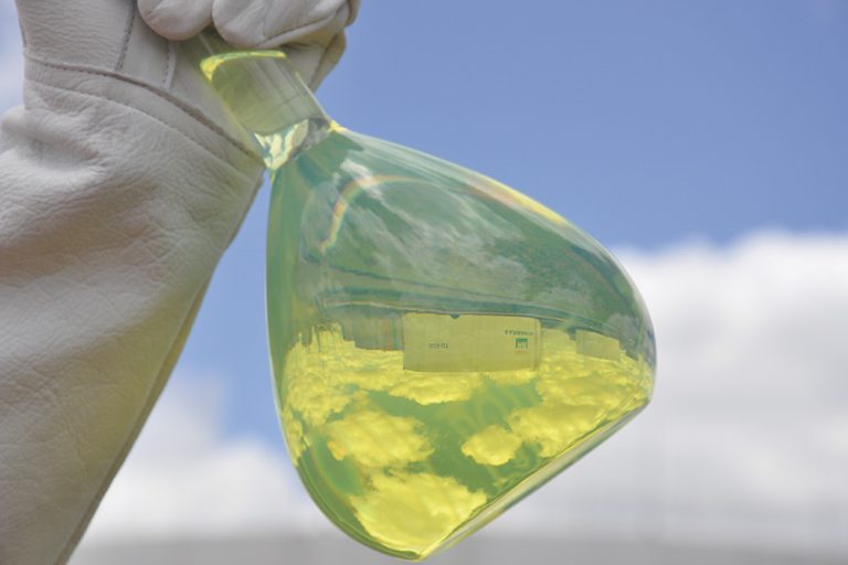 Amostra do Diesel R, feito a partir de conteúdo renovável como óleo vegetal – Imagem: Michel Chedid/Agência Petrobras