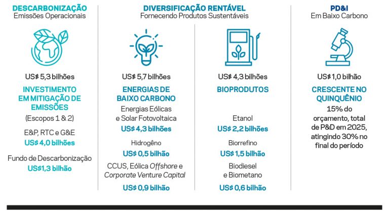 Quando se levam em conta todas as iniciativas de baixo carbono, serão investidos 5,7 bilhões de dólares, principalmente em geração eólica, solar fotovoltaica, hidrogênio de baixa emissão de carbono e CCUS. Outros 4,3 bilhões serão aplicados em bioprodutos, destacando que somente para etanol, biodiesel e biometano serão reservados 2,8 bilhões de dólares. Além disso, 5,3 bilhões financiarão a descarbonização da operação com mitigação de emissões e 1 bilhão de dólares incrementarão a pesquisa e o desenvolvimento de projetos de baixo carbono.