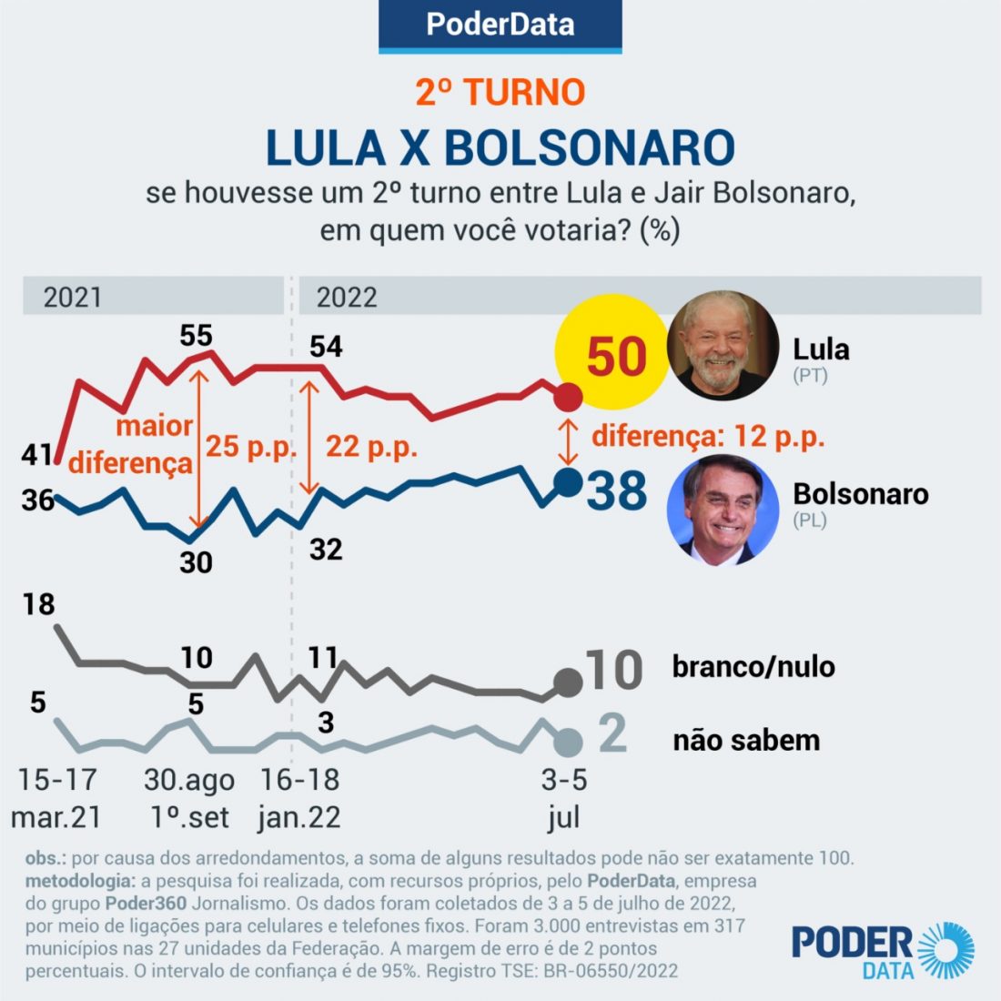 Para chegar aos resultados, o instituto entrevistou por telefone 3 mil eleitores entre os dias 3 a 5 de julho de 2022. A margem de erro é de 2 pontos percentuais. O intervalo de confiança é de 95%.
