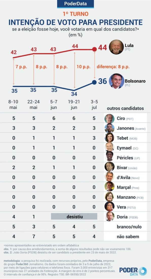 Pesquisa PoderData divulgada nesta quarta-feira 6 mostra que o ex-presidente Lula (PT) tem 44% das intenções de voto  no primeiro turno contra 36% do presidente Jair Bolsonaro (PL). No levantamento anterior, feito há 15 dias, o petista somava os mesmos 44% e o ex-capitão, 34%.