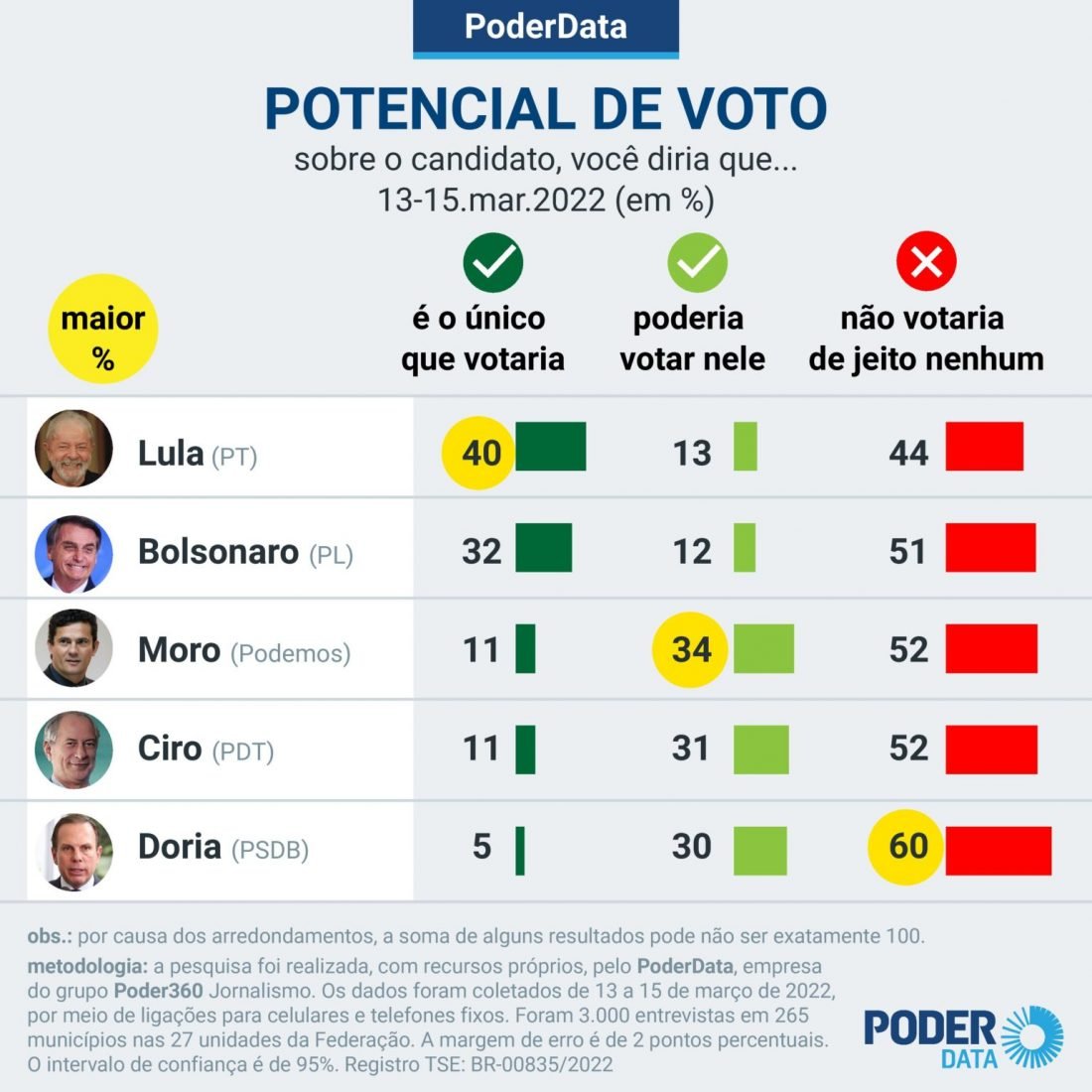 Entre os pré-candidatos à presidência da República, o petista é o menos rejeitado, com 44%. Ao mesmo tempo, quando considerado como único voto possível, Lula também fica à frente de seus adversários, com 40% das intenções.