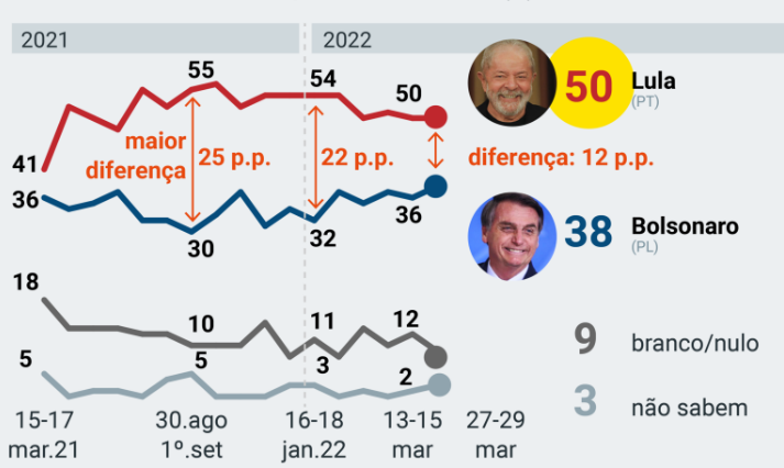 Na mesma rodada, Bolsonaro tinha 36%. O ex-presidente já chegou a ter 25 pontos de vantagem contra o ex-capitão no ano passado.