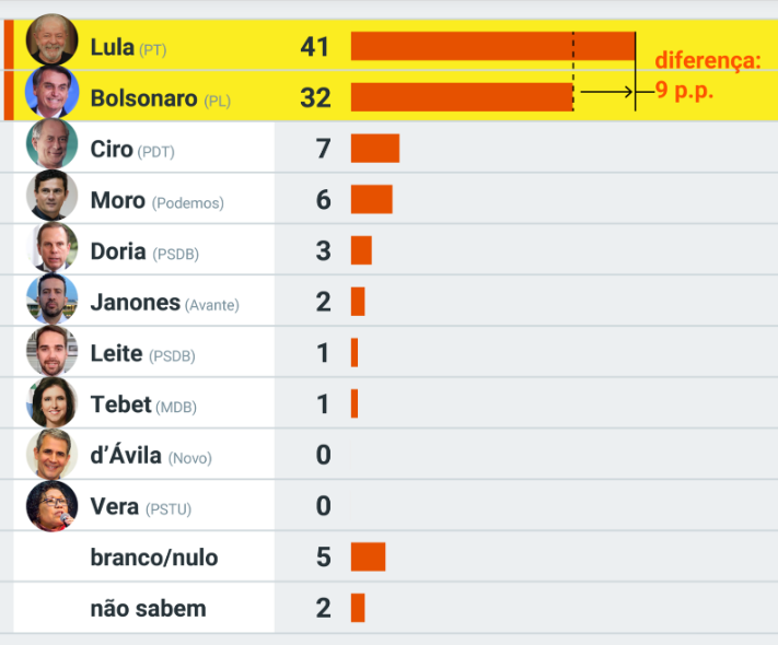 De acordo com o levantamento, na sequência, aparecem Ciro Gomes (PDT), com 7%, Sergio Moro (Podemos), com 6%, João Doria (PSDB), com 3%, André Janones (Avante), com 2%, e Eduardo Leite (PSDB) e Simone Tebet (MDB), com 1% cada um. Vera Lúcia (PSTU) e Luiz Felipe D’Ávila (Novo) não pontuaram.