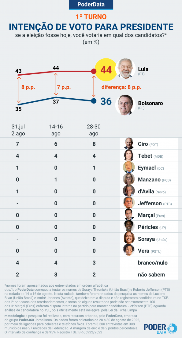 Pesquisa PoderData divulgada nesta quarta-feira 31 mostra que o cenário eleitoral não mudou após o início da propaganda eleitoral, as entrevistas dos presidenciáveis ao Jornal Nacional, da TV Globo, e o primeiro debate entre os candidatos na TV Band.