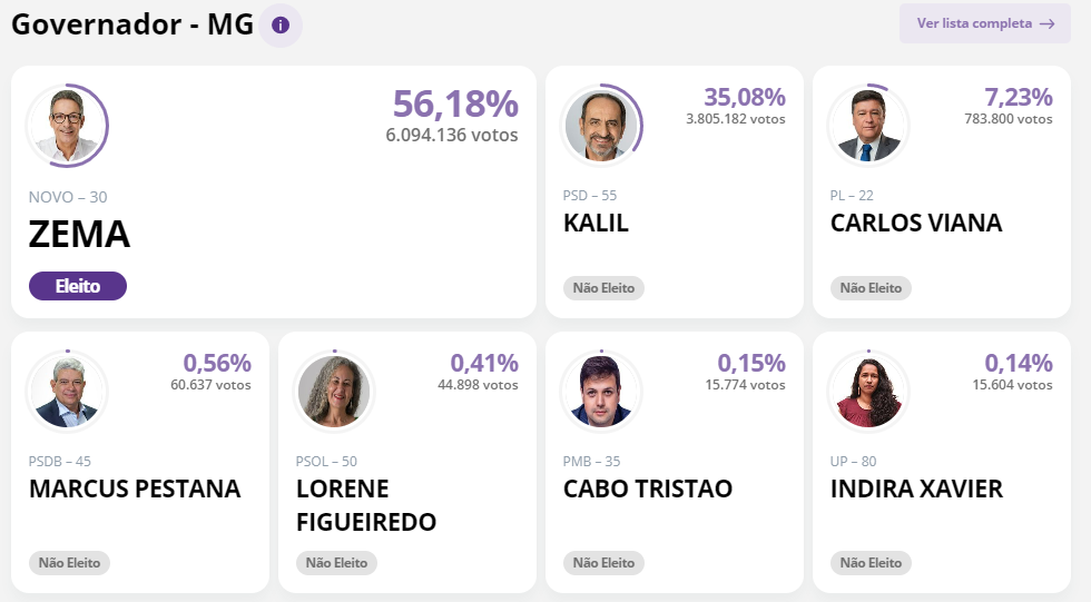 O bolsonarista foi opção de menos de 800 mil mineiros, enquanto Zema somou mais de 6 milhões de votos. O nome apoiado por Lula, o ex-prefeito Alexandre Kalil (PSD), terminou a disputa com 3,8 milhões.