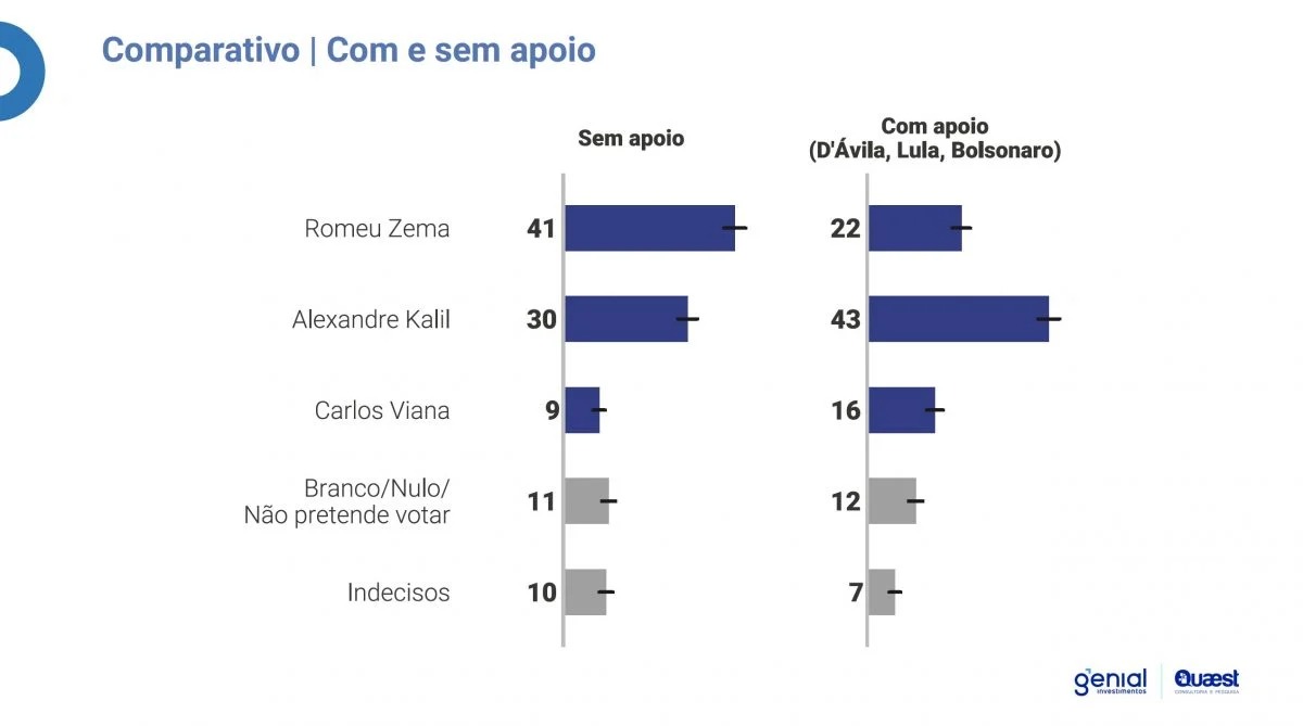 De acordo com o levantamento, ao ter seu nome associado ao ex-presidente, Kalil cresce 13 pontos, partindo de 30% para 43% das intenções de voto. Já Zema, quando tem seu nome vinculado ao de Luiz Felipe D’avila (Novo), perde 19 pontos percentuais, o que derruba suas indicações de voto de 41% para 22%.
