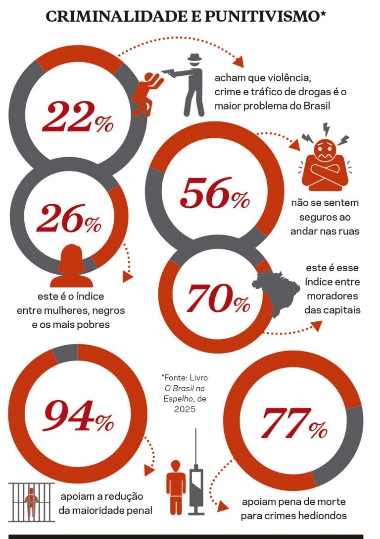 Os brasileiros estão inseguros por causa da criminalidade, e não é de agora. Esse sentimento faz com que confiem menos nos outros e se tornem mais punitivistas, ou seja, queiram soluções “linha-dura”, como a redução da maioridade penal e a pena de morte. Entre mulheres, negros e aqueles que ganham até um salário mínimo, a preocupação com o crime é ainda maior do que a média. Esse quadro foi descrito em um livro do ano passado, O Brasil no Espelho, baseado em 9,9 mil entrevistas realizadas no fim de 2023. É um guia para entender uma guinada de Lula e do governo. Está em marcha no lulismo a construção de uma espécie de “punitivismo progressista”, com o qual o presidente pretende melhorar o ibope e as chances de reeleição.