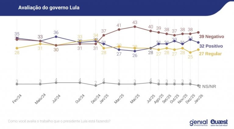 Em janeiro, 49% dos entrevistados afirmaram desaprovar o governo, enquanto 47% disseram aprová-lo; outros 3% não souberam ou não responderam. No levantamento anterior, a taxa de desaprovação era a mesma, e a aprovação aparecia um ponto percentual acima — variação considerada dentro da margem de erro, de dois pontos percentuais.