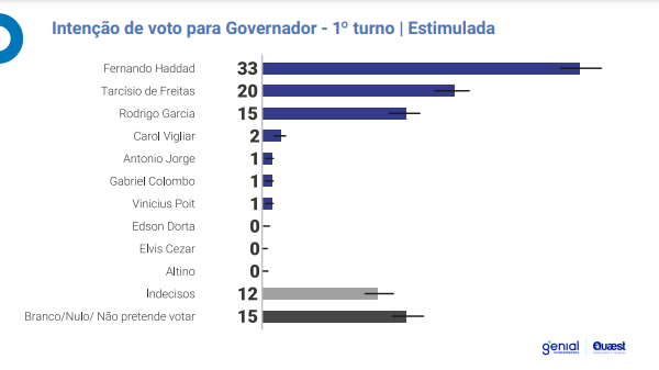 Na sequência, aparece Rodrigo Garcia (PSDB), com 15%. Os demais candidatos não chegaram aos dois dígitos nas intenções de voto.