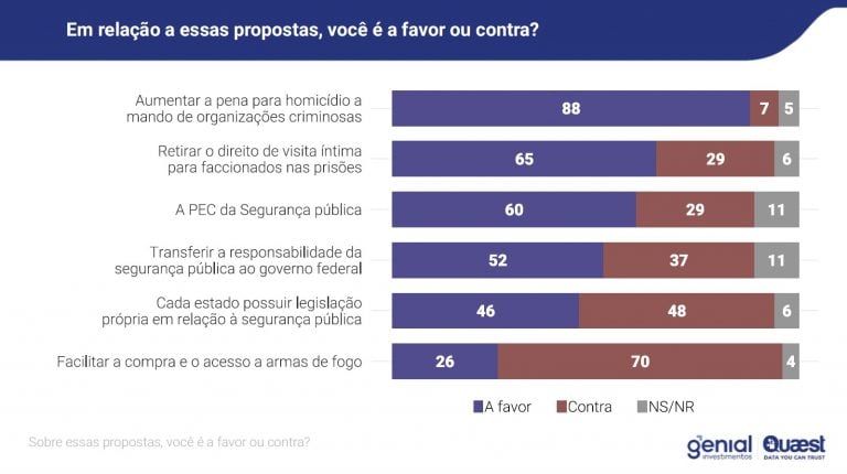 A Quaest também monitorou a avaliação dos brasileiros sobre uma série de outras propostas sobre a segurança pública que tramitam em Brasília. Algumas delas integram o PL Antifacção. Outras tramitam em separado, como é o caso da PEC da Segurança.