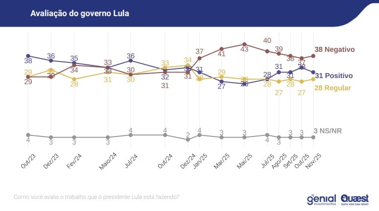 Na pesquisa anterior, realizada em outubro, a diferença era de apenas 1% (49% desaprovavam, 48% aprovavam). Desde julho, quando o governo manteve postura firme após o anúncio do tarifaço de Donald Trump contra produtos brasileiros, o cenário era de recuperação de fôlego do petista.