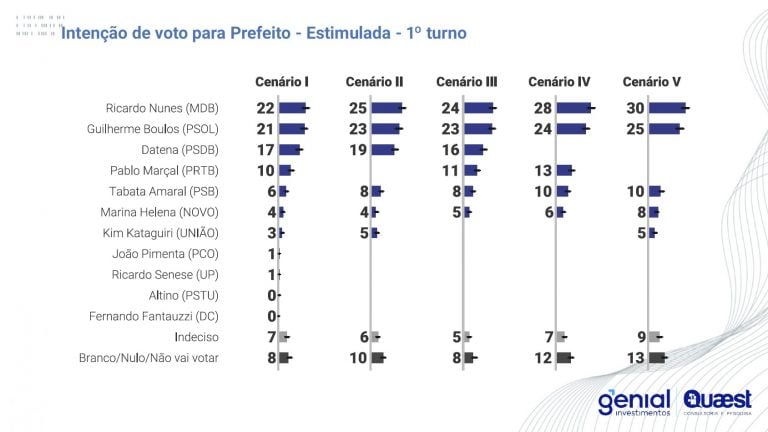 Nessa que é a primeira pesquisa da Genial/Quaest sobre o pleito paulistano, Nunes aparece com 22% das intenções de votos. Logo em seguida, Boulos ficou com 21%.