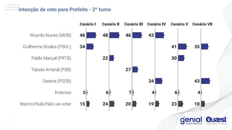 Em um eventual segundo turno entre Nunes e Boulos, o atual prefeito da capital paulista obteve 46% das menções, enquanto Boulos ficou com 34%. No caso de uma disputa contra Datena, Nunes ficou com 43%, ao passo que o apresentador alcançou 34%.