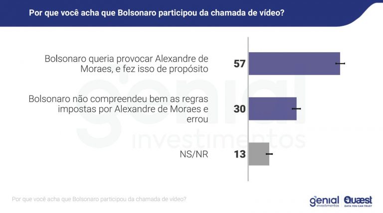Para a maioria dos entrevistados, Bolsonaro descumpriu as ordens da Corte apenas para “provocar Moraes”. A avaliação atinge 57% dos entrevistados. Outros 30% acham que Bolsonaro não havia compreendido as regras impostas pelo ministro naquela ocasião. Só 13% não souberam ou não quiseram responder.