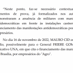 A decisão do STF também menciona o financiamento de “empresários do agro” e do repasse, via tenente-coronel Cid, de R$ 100 mil a militares envolvidos na trama.