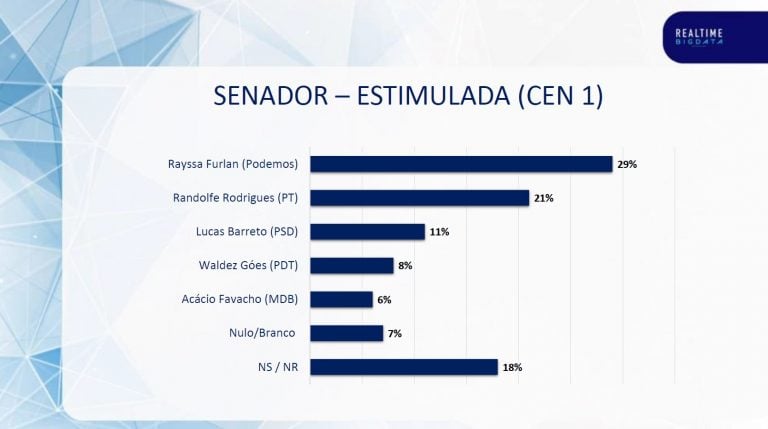 De acordo com a pesquisa, Rayssa tem 29% das intenções de voto e ficaria com a primeira cadeira das duas em disputa no ano que vem. O já senador petista aparece com 21% das menções e ganharia a segunda vaga disponível. Os demais adversários estão com pelo menos 10 pontos de desvantagem. Confira os resultados: