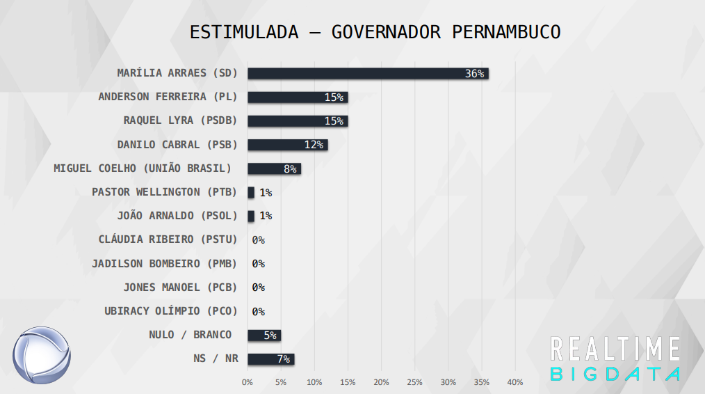 No levantamento,  Anderson Ferreira (PL) e Raquel Lyra (PSDB) aparecem com 15%. Logo atrás está Danilo Cabral (PSB), com 12%, e Miguel Coelho (União Brasil), com 8%.