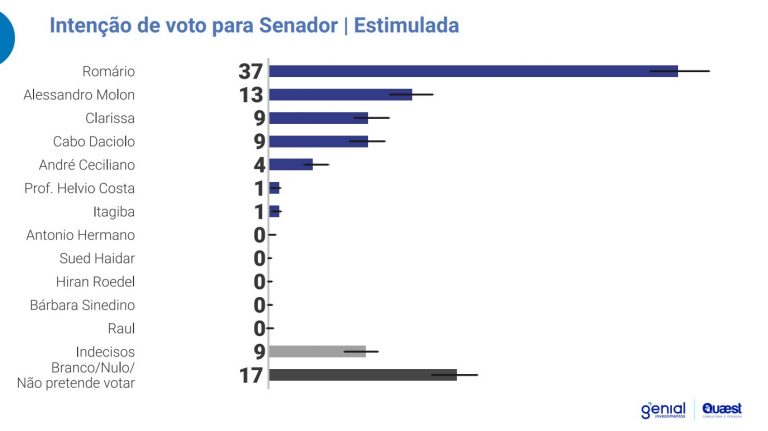 O senador Romário (PL) deve garantir mais oito anos ocupando a vaga pelo Rio de Janeiro. O ex-jogador tem, segundo a pesquisa Quaest divulgada nesta quinta, 37% das intenções de voto. Alessandro Molon (PSB), que está em segundo lugar, tem apenas 13%.