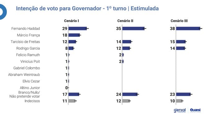 Em um cenário com mais candidatos, Haddad somaria 29% e seguiria líder. Na sequência, aparecem França, com 18%, Tarcísio, com 12%, Garcia, com 8%, e Felicio Ramuth (PSD), Vinicius Poit (Novo), Gabriel Colombo (PCB), Abraham Weintraub (PMB) e Elvis Cezar (PDT) com 1%.