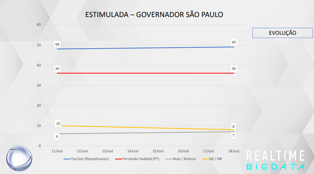 Nos votos totais, quando são excluídos brancos e nulos, Tarcísio chega a 58% e Haddad fica com 42%. Para chegar aos resultados, o instituto entrevistou, por telefone, 1200 pessoas entre os dias 17 e 18 de outubro. A margem de erro é de 3 pontos percentuais para mais ou para menos e o nível de confiança é de 95%. A pesquisa, contratada pela RecordTV, foi registrada sob o número SP-08867/2022.