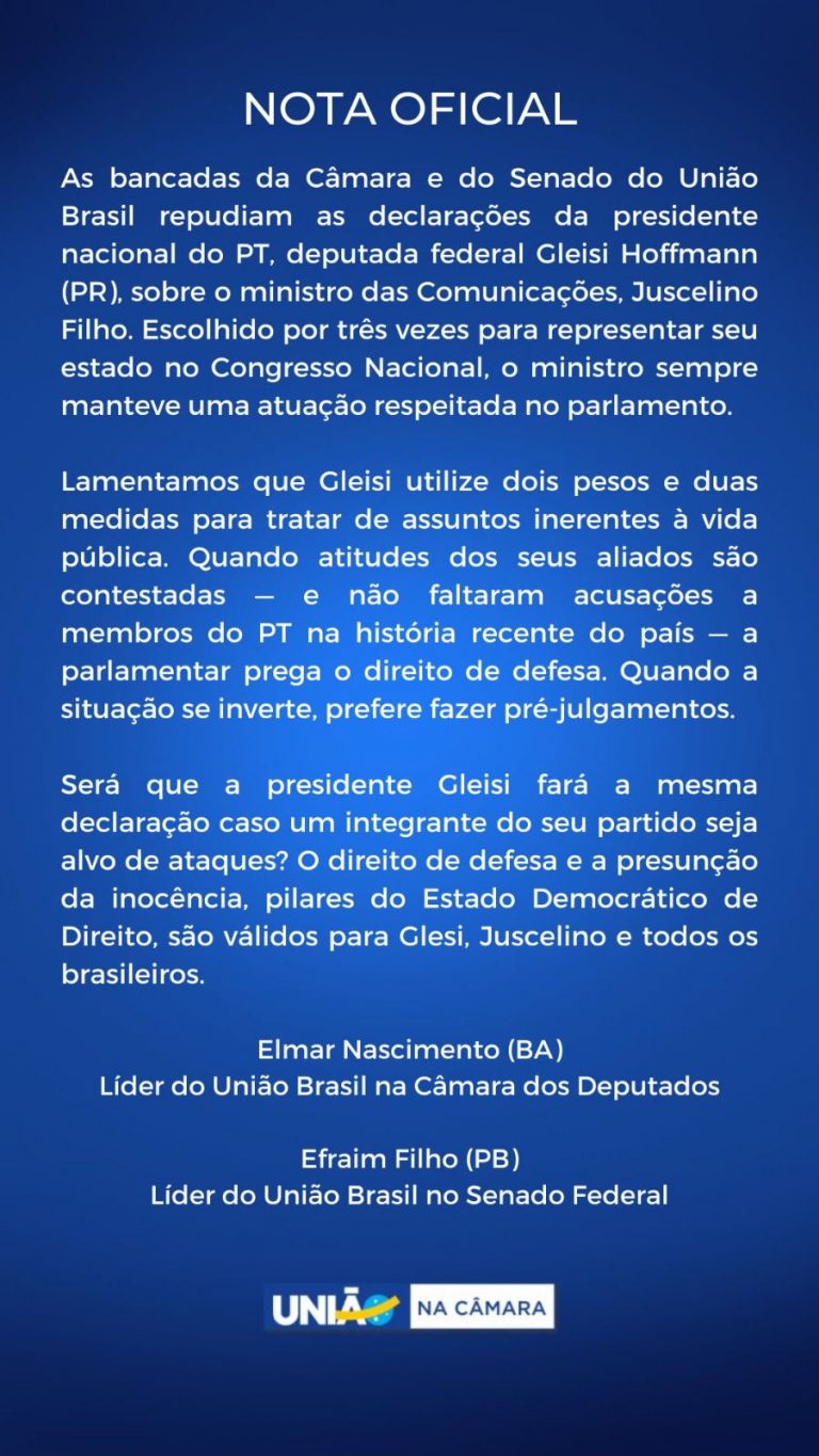 O União ainda questiona se Gleisi manterá a mesma postura em caso de acusações contra ministros do PT e cobra que Juscelino tenha espaço para provar sua inocência. Leia a íntegra da publicação: