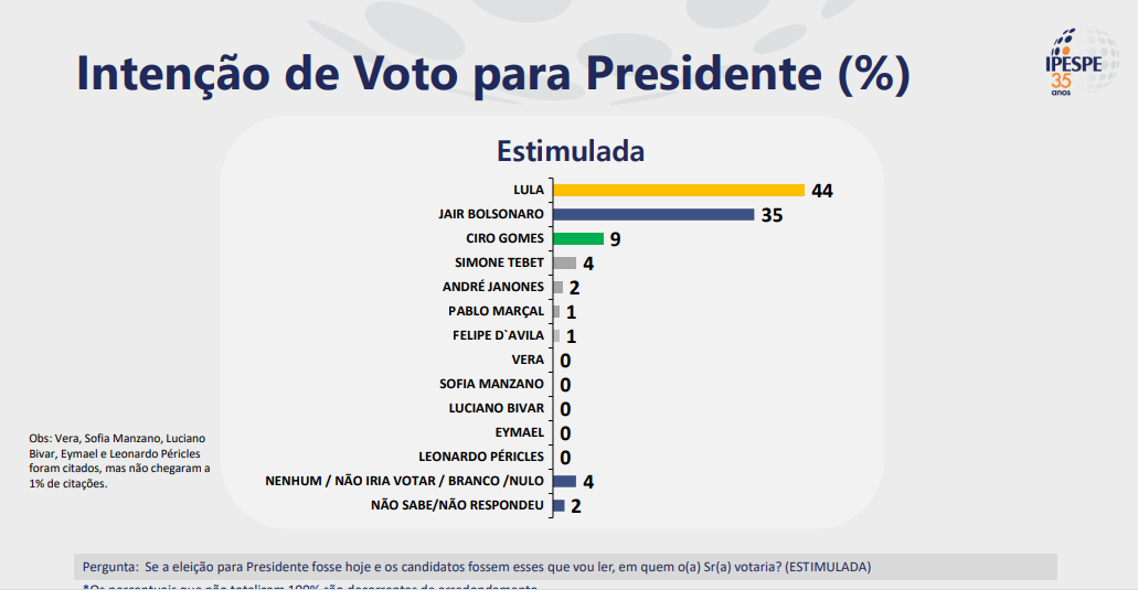 Pesquisa Ipespe divulgada nesta segunda-feira 25 mostra que o ex-presidente Lula (PT) lidera a corrida eleitoral com 44% das intenções de voto. O presidente Jair Bolsonaro (PL) aparece na sequência, com 35%.