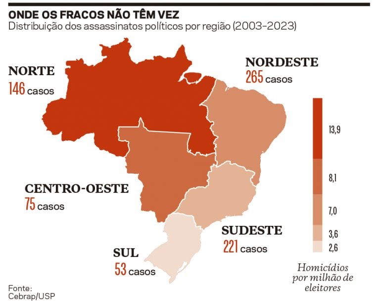 O número de assassinatos por milhão de eleitores é muito superior nas regiões Norte e Centro-Oeste (gráfico à pág. 31). A pesquisa revela, ainda, maior prevalência de casos em pequenas cidades, marcadas por menor presença do Estado, capacidade limitada de aplicação da lei e concentração de poder em poucas famílias. “Alguns desses municípios se situam em regiões de fronteira submetidas à rápida expansão agrícola e à exploração de recursos naturais, o que gera conflitos intensos pela posse da terra, enquanto a capacidade institucional local para a mediação é restrita. A combinação de autoridade estatal frágil, relações de poder personalizadas e disputas por recursos de alto valor cria condições propícias à rivalidade política violenta”, diz um trecho do estudo.