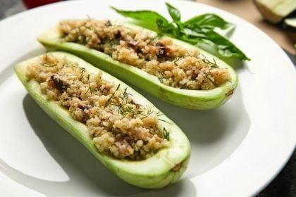 Recheie as abobrinhas com a mistura de quinoa. Volte ao forno a 200 °C por cerca de 10 minutos para aquecer e integrar os sabores. Sirva em seguida.