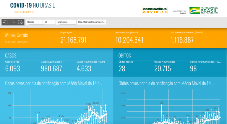 De acordo com a Secretaria de Estado da Saúde de Minas, houve, ao todo 21.029 mil mortes no estado e 991 mil casos confirmados de Covid. Todos os 853 municípios já contabilizaram ao menos um caso. O Governador Romeu Zema anunciou que todo estado está na fase roxa por quinze dias.