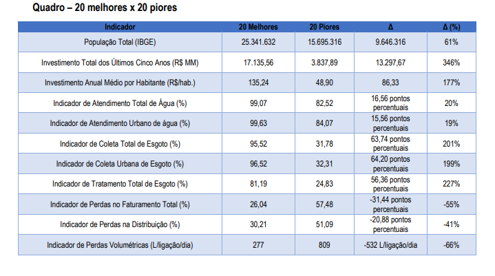 “A porcentagem da população com rede de coleta de esgoto é ainda mais discrepante: 95,52% da população nos 20 melhores municípios tem os serviços; e somente 31,78% da população nos 20 piores municípios são abastecidos com a coleta do esgoto”, diz o documento.