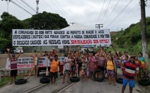 Moradores protestam desde terça-feira em frente a uma das áreas de atuação da Braskem, no bairro do Mutange. Eles reivindicam indenização e realocação em razão do afundamento de bairros na capital alagoana – Reprodução/Edilson Omena