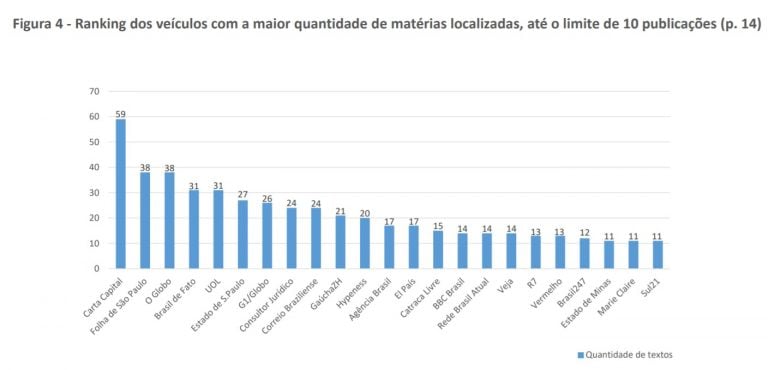 Com o fechamento daquele mês, passaram à frente Folha de S. Paulo e O Globo, que acumularam 38 publicações. Brasil de Fato, antes em segundo lugar, caiu para quarto com 31 textos. CartaCapital se manteve como o veículo que mais tratou do assunto, com 59 matérias.