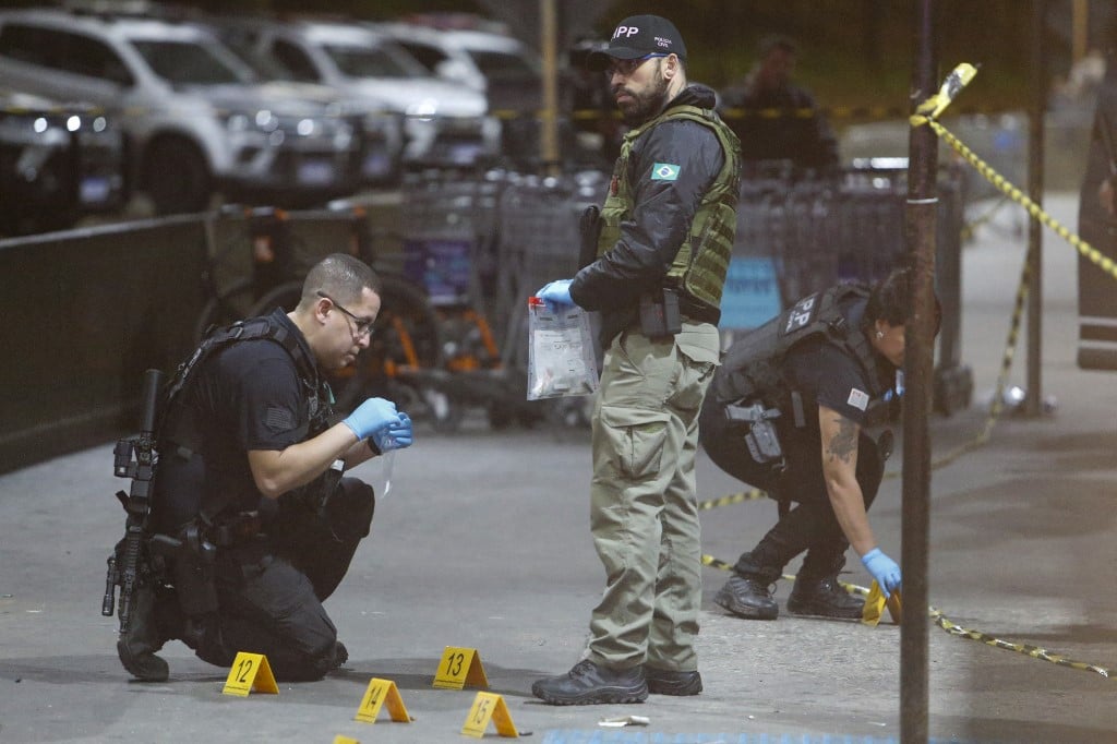 Agentes fazem a perícia após assassinato a tiros no Aeroporto de Guarulhos. Foto: Miguel Schincariol/AFP