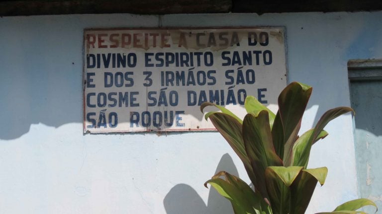 Na primeira, entre casebres antigos amontoados, está a Casa de Ogum, uma espécie de catedral desta religião. Ao chegar perto do terreiro, consigo ler, em caixa alta, uma saudação ao Divino Espírito Santo, e aos três irmãos: São Cosme, São Damião e São Roque, que, segundo sugere a plaqueta fixada na parede, sustentam o templo.
