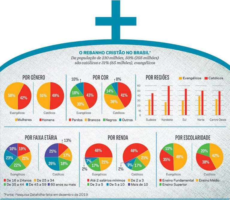 Confrontar interesses de líderes evangélicos tem um preço político. O peso eleitoral protestante hoje é inegável. Obra, primeiro, da demografia. Em dezembro de 2019, 31% dos brasileiros eram crentes, segundo o Datafolha. Em 2000, eram 15%, apontava o censo do IBGE. Em 2010, 22%, em novo censo. Os católicos eram 50% em 2019, conforme o Datafolha. Nesta pesquisa, a proporção de evangélicos de 16 a 34 anos (40%) superava a dos discípulos de Roma (30%). No ritmo de avanço pós-1991, os protestantes serão a maioria geral na próxima década, calcula um estatístico do IBGE, José Eustáquio Diniz Alves.