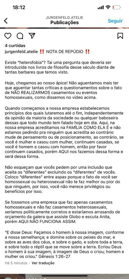 Após a repercussão do caso nas redes sociais, o casal proprietário do ateliê publicou um vídeo, acompanhado de uma ‘nota de repúdio’, declarando-se cristãos e reafirmando seguir ‘princípios’ que incluem a política de não realizar serviços para casamentos ou eventos homossexuais.