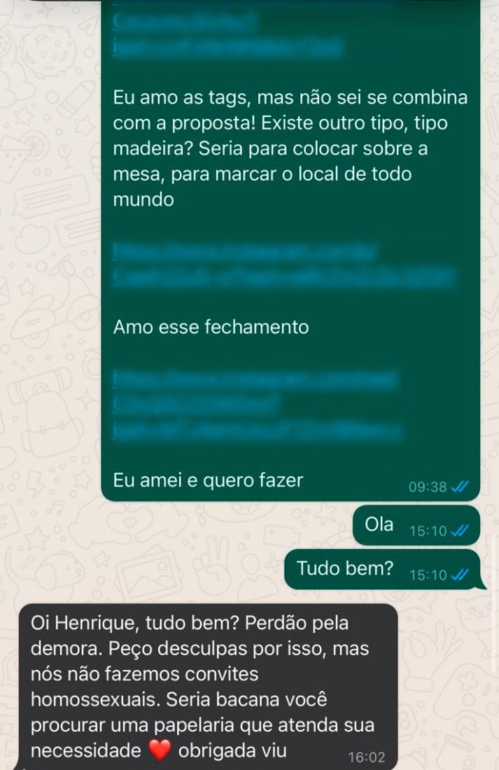 Henrique Nascimento entrou em contato com o ateliê via WhatsApp para orçar diferentes modelos de convite para o seu casamento com Wagner Soares. Segundo a vítima, o atendimento ocorreu normalmente até ele citar o nome do noivo, momento em que deixou de ser respondido. Horas mais tarde, a atendente retornou a mensagem, informando que não poderiam confeccionar “convites homossexuais”.