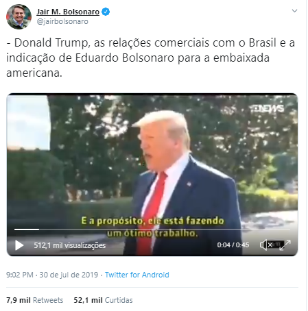 Trump foi retuitado ou mencionado pelos quatro Bolsonaros 39 vezes. Quem demonstrou maior apreço foi Eduardo, com 26 menções. O filho mais novo, que ajudou na escolha do chanceler Ernesto Araújo, chegou a ser proposto por Bolsonaro como embaixador nos Estados Unidos – a nomeação foi abandonada depois de resistência no Congresso.
