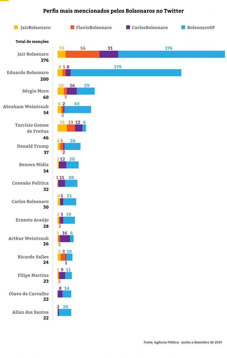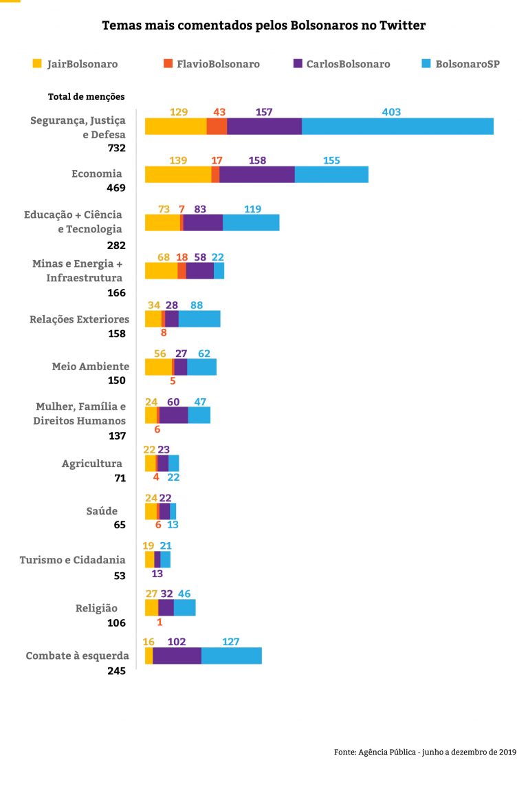 A Agência Pública monitorou todos os tuítes publicados pelo presidente e seus três filhos mais velhos de junho a dezembro de 2019 e analisou os temas mais comentados, as hashtags mais usadas e as contas com as quais eles mais interagiram.