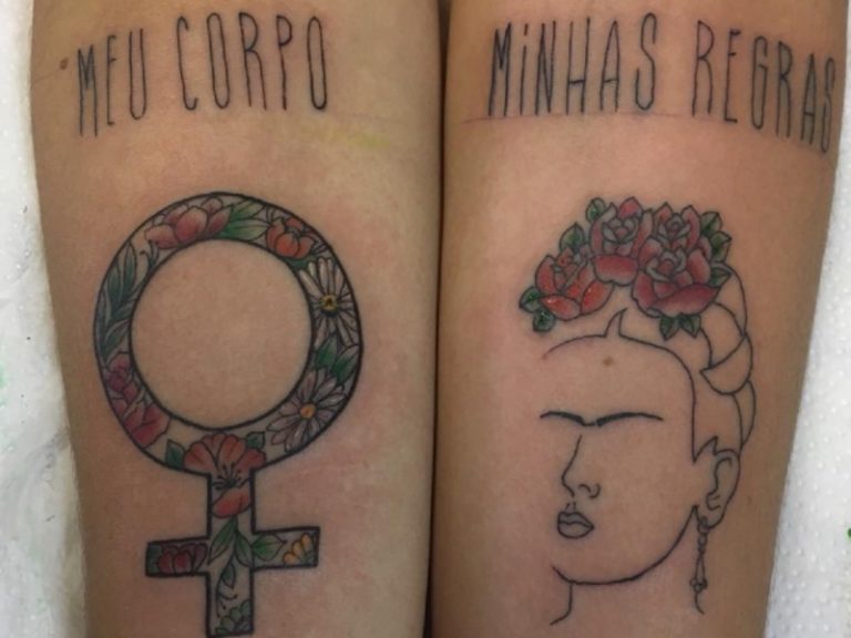 As tatuagens mais procuradas no estúdio de Navega são desenhos e frases que remetem à luta feminista. Foi o que pediu a paulistana Camila Victor. A jornalista, de 41 anos, fez no começo deste ano uma tatuagem em seus braços retratando o símbolo do movimento feministas. Camila tatuou também o rosto de Frida Kahlo, a artista mexicana que virou símbolo de luta das mulheres, e a frase “Meu corpo, minhas regras”, jargão utilizado pelo movimento.