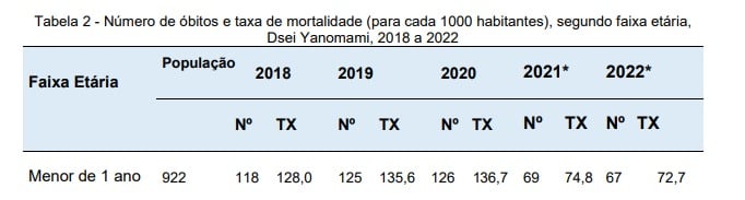 Em 2020, segundo o documento, 126 crianças Yanomami com menos de um ano de idade morreram. Quando comparado com os anos anteriores, é o maior número de crianças mortas nessa faixa etária, no período que vai de 2018 a 2022. Em relação à taxa de mortalidade, os anos de 2018 e 2019 também apresentaram números acima dos três dígitos.