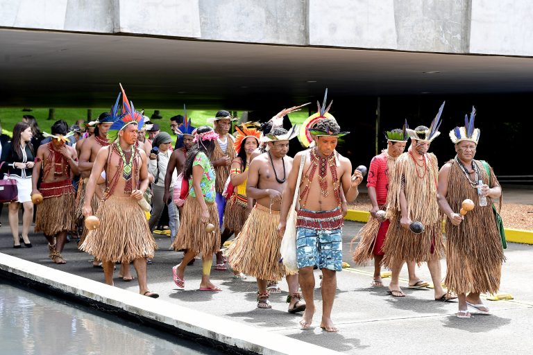 Pataxós na sede do STJ, em 2019, durante o processo de revisão da demarcação da Terra Indígena de Barra Velha.