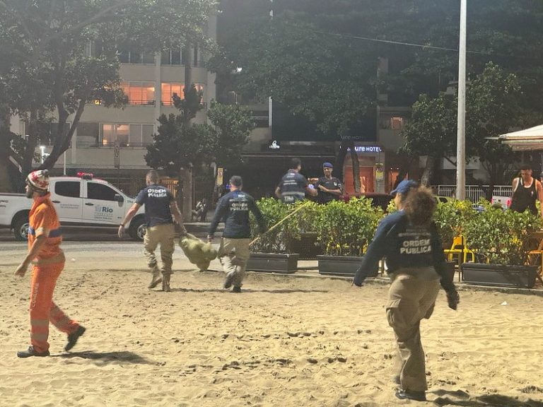 Agentes de Ordem Pública da Prefeitura do Rio retiram objetos enterrados na areia de Copacabana antes do show da Madonna. Foto: Divulgação