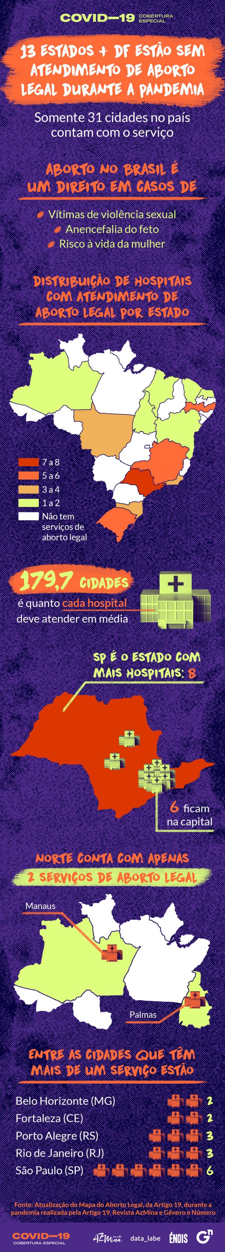 Os telefonemas fazem parte de um levantamento realizado pela Artigo 19, em parceria com a revista AzMina e a Gênero e Número, para identificar como está o serviço de aborto legal no Sistema Único de Saúde (SUS) durante a pandemia do novo coronavírus. Entre 27 de abril e 4 de maio deste ano, as organizações entraram em contato por telefone com os 76 hospitais que realizavam a interrupção legal de gravidez, identificados em 2019 pelo Mapa do Aborto Legal, da Artigo 19. Pouco mais da metade (55%) mantêm o serviço durante a pandemia de covid-19. E boa parte dos atendimentos evidenciam o desconhecimento de diversos funcionários da saúde sobre os casos de aborto previstos em lei.