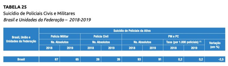 No Brasil, o número de policiais que tira a própria vida é maior que o dos que morrem em serviço. Segundo o relatório anual do Fórum Brasileiro de Segurança Pública, divulgado em outubro de 2020, só em 2019, 65 policiais militares e 26 civis cometeram suicídio. Naquele mesmo ano, o número de PMs mortos em serviço foi de 56 e o de policiais civis, 16. O número de policiais mortos fora de serviço foram 101.