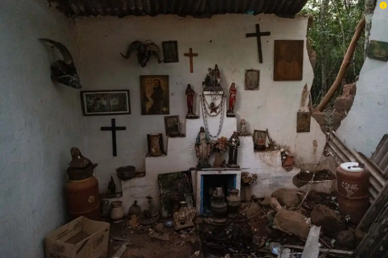 Ele aponta que a estrutura da sala de festejo, feita em adobe e pedras, foi danificada. Também foi demolida parte do quarto anexo, onde fica o altar, ou “peji”. A placa da entrada, agora sobre escombros, resistiu. Nela se lê “Peji Pedra Branca de Oxóssi: A mata se levanta, poeira levanta, pedra do morro desce e a terra estremece”.