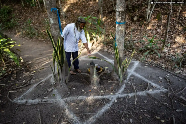 A porta azul que exibe o salmo 91 já não guarda o pequeno altar do terreiro de jarê do Peji Pedra Branca de Oxóssi, em Lençóis (BA), na mata do Vale do Curupati, a cerca de 420 km de Salvador. A construção se encontra parcialmente destruída e ainda abriga pequenas esculturas religiosas, incluindo uma Iemanjá agora decapitada e cabeças de carneiros, mas não vem recebendo celebrações de fé desde que servidores do Instituto Chico Mendes (ICMBio) iniciaram sua demolição, em 21 de julho. Os planos de reparação do ocorrido devem ser apresentados até o fim de agosto.