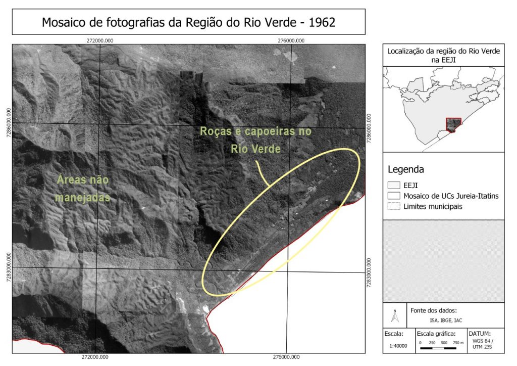 Mapa do território em 1962, produzidos a partir da colaboração entre caiçaras e acadêmicos. O mosaico de ortofotos destaca roças, capoeiras e capoeirões, sendo esses últimos áreas abandonadas em diferentes estágios de regeneração da floresta.
